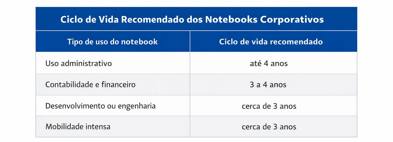 A vida útil média do notebook corporativo é de três a quatro anos. Após esse período, aumentam os riscos de falhas, lentidão e custos de manutenção. Essa média pode se estender até cinco anos em casos de baixo uso, bom ambiente e manutenção adequada, mas para ambientes de missão crítica, o ideal é planejar a troca entre o terceiro e o quarto ano.